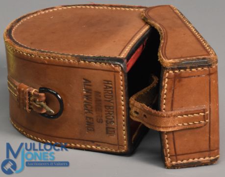 Hardy Bros Limited maker Alnwick England red baize lined block leather reel case with original strap and buckle, internal measurements 3 3/8" x 1 3/8", with a full length handle slot, fine condition