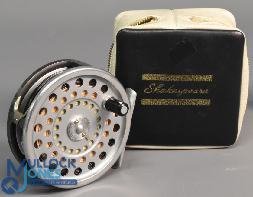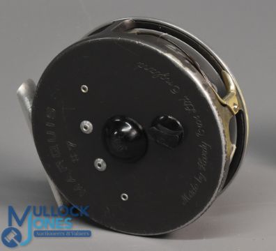 Hardy Bros "The Marquis 7" alloy fly reel 3 7/16" ventilated spool, 2 screw latch, black handle, rear tensioner, constant check, 'U' shaped alloy line guide and foot, light rim wear, Shakespeare zip case. Runs very well