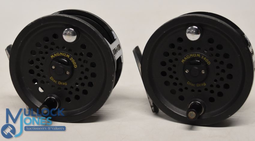 Leeda Magnum 200D, 4" alloy wide spool salmon fly reel, twin U line guide, backplate brake adjuster, good and a similar Magnum 140D reel, both working well. (2)