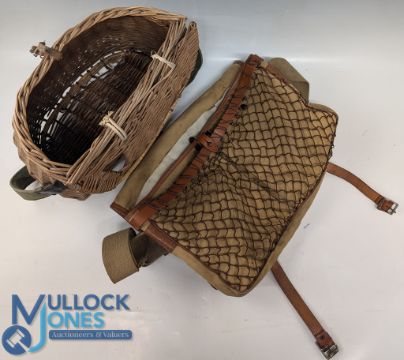 Vintage Liddesdale Canvas Fishing Tackle Bag, with leather trim, waterproof liner, webbing shoulder strap, showing some signs of age-related wear, with a Wicket Creel, also with age related wear (2)