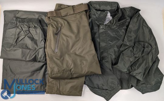 Fishing Clothes & Accessories - to include a Carp kinetic Native fleece size M, Thinsulate black hat, Oxford snug thermal head and neck wear on card, Blue Castle waterproof jacket and trousers size XL, TF Gear waterproof trousers, Dickies fleece lined trousers size M, Port West black waterproof over trousers. All in very light used and some unused condition (box of)