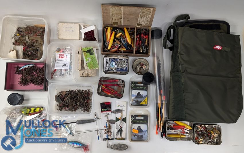 Fishing accessories: to include JRC defender wet bag, trace spoons, lures, three boxes of treble hooks, minnows devons, Tobby lures floats, rigs (box of)