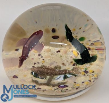 John Deacons Scotland Fish Paperweight: 3 fish swimming around an anchor on the seabed, #8cm diameter with label to base. G