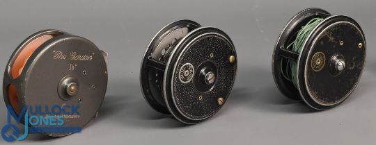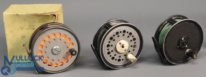 Sharpes of Aberdeen "The Gordon" 3 1/2" alloy trout fly reel, ventilated spool, constant check. In correct original box, light wear and runs well. J W Young & Son "The Pridex" alloy fly reel 3 1/2" solid spool, 2 screw latch, constant check. Runs well. Edgar Sealey Redditch alloy fly reel 3 1/2" ventilated spool, 2 screw latch, constant check. Runs well. (3)