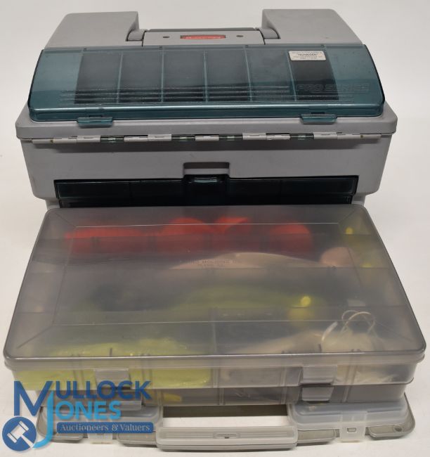 A collection of fishing tackle, as follows: Rubber Maid Pro Series tackle box, 16 3/4" x 11 1/2" x 10 7/8". Woodstream Clear View large container, 14" x 10" with a collection of 24x 5" shads and hooks. 2x Plano Clear View large containers, 14" x 8 1/2" with a large selection of big shads with weighted hooks and diving lures. All named