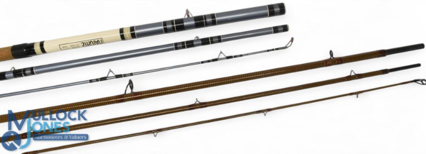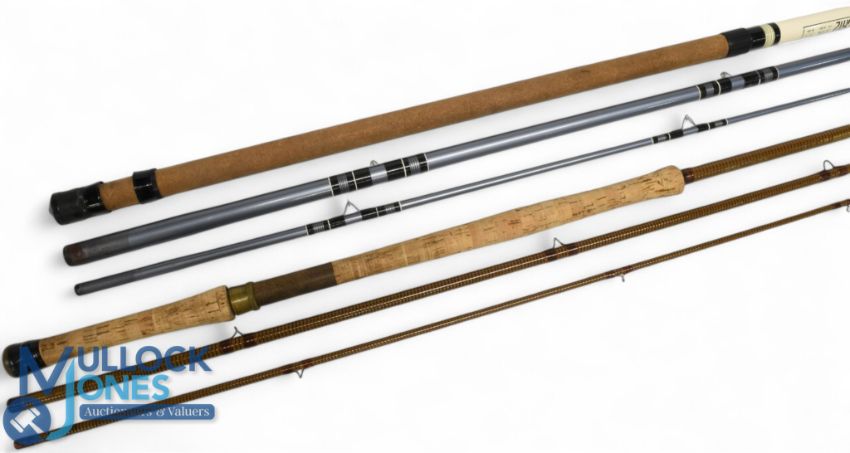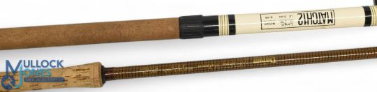 Daiwa Osprey Salmon Graphite Coil GCF-15 salmon fly rod 15ft 3pc line 10/11#, 26" handle, alloy sliding reel fitting, lined stripping/butt rings, MCB (butt taped). Match 12 hollow glass float/match rod 12ft 3pc B25 action, 30" handle, alloy sliding reel fittings, lined butt/tip stand off rings. (2)