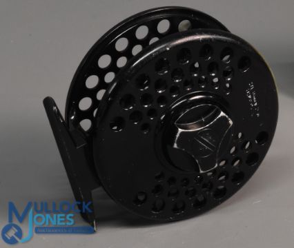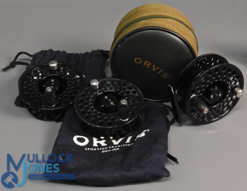 Orvis Battenkill III mid arbor alloy trout fly reel with 2 spare spools, 3 1/4" ventilated frame and spool, 2 screw latch, counter balanced handle, large rear spindle tensioner, constant check, MZC and cloth pouches. Light use, runs well