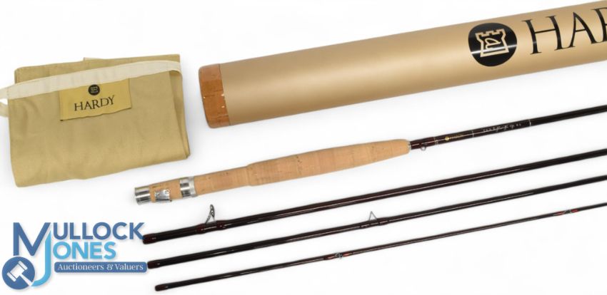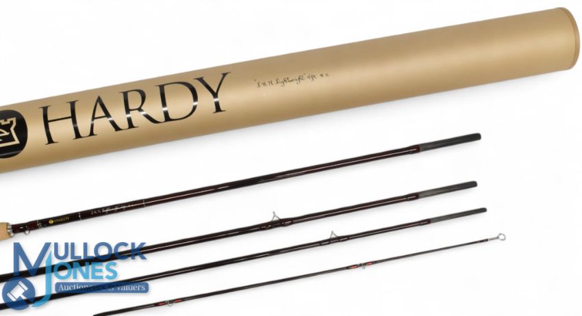 Fine Hardy 'LRH Lightweight' 9ft 4pc graphite trout fly rod line #5 carbon spigots, appears unused, in maker's cloth bag, alloy tube with polished cork stopper and outer sleeve