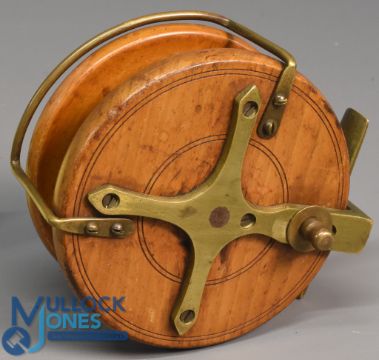 Wallace and Kerr, Edinburgh stamped 4" Nottingham and brass star backed reel twin handled, Bickergyke line guide, Slater 4x screw quick release latch, rear on/of check button, good overall condition