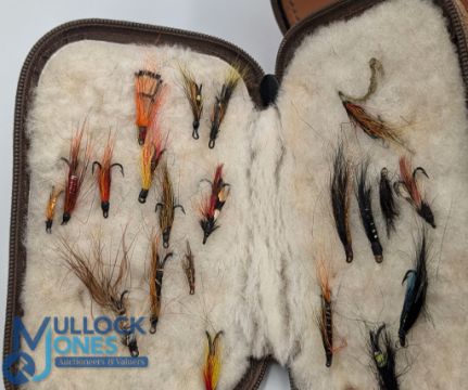 Hardy Bro Leather Fishing Reel Case 14cm diameter with felt lining, fly wallet with wool lining and a selection of flies, and a Loch Leven fly tin box (3)