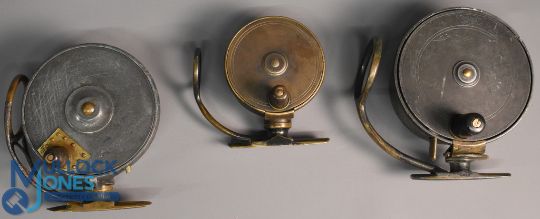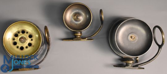 Malloch's Patent all brass side caster reel 3 ¼" winding plate with twisting foot and screw drum fixing, fixed check, good overall, a Malloch 4 ½" alloy side casting reel with optional check, twisting foot, quick release drum, chips to backplate and a Forest of Kelso Malloch style reel with replacement handle plate and modified drum (3)