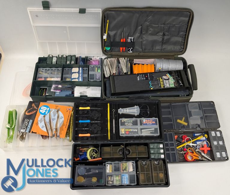 Fishing Tackle Collection - mostly coarse fishing to include TT Gears Tackle Bag with a selection of rigs, a hard plastic NGT tackle box with tools, lead shot etc, a tackle box of rig materials with tools, Korum tackle box with bait bands, swivels, tools, marker gum line dispenser, Savage Gear box of jelly lures (box of)