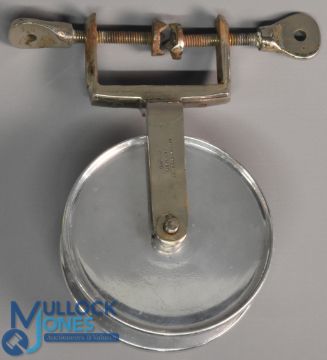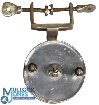 Interesting and scarce Hardy Bros "The Natal Surf Reel", alloy 4 1/2" polished solid spool, twin reverse taper handles with alloy boat clamp stamped Hardy Bros (note rear retaining nut missing)