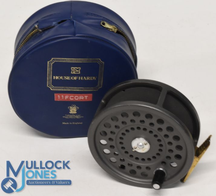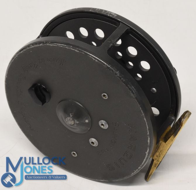 Hardy Bros "Marquis Salmon No 2" alloy fly reel 4 1/8" ventilated spool with 2 screw latch, black handle, rear tensioner, constant check, ribbed brass foot, MZC. Light wear, runs well