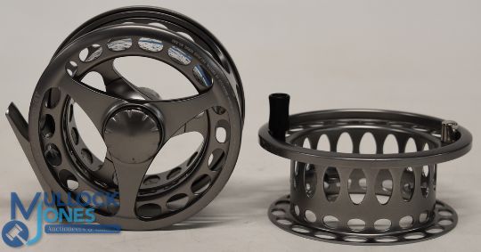 Danielson L5W 4Seven W alloy salmon fly reel with spare spool, 3 13/16" caged ventilated wide spool, centre knob spool release, counter balanced handle, large rear spindle tensioner, constant check. No case, very light use