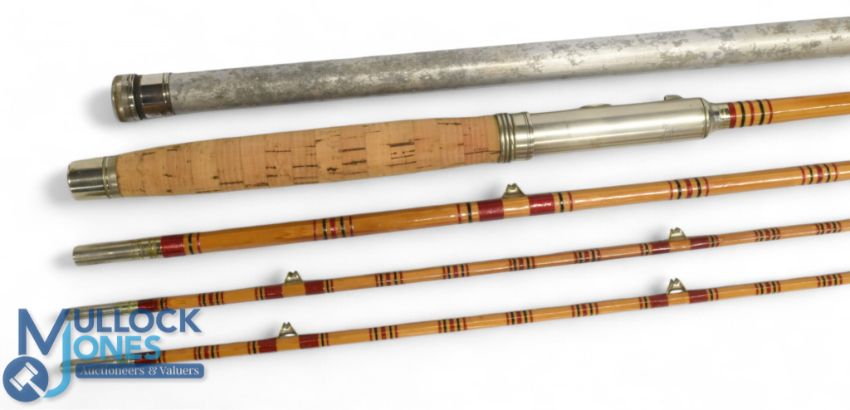 Geo I Varney Maker, Montague City, USA 10' 3-piece split cane bamboo rod, with factory correct spare tip, Tulip guides, whipped burgundy, black tipped, nickel rolled ferrules with stoppers, 13" handle with cork lower grip, nickel reel fitting with sliding ring and butt cap, rod comes with alloy tip tube and inner cloth sleeve plus outer cloth bag.