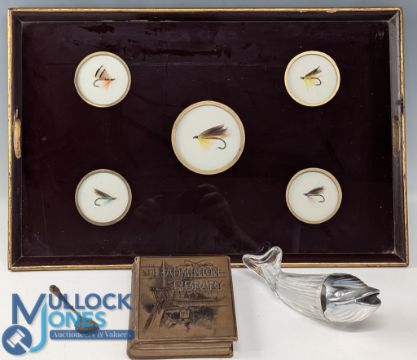 Fly Fishing Tray: large glass topped Tray made by Ebbels with 5 inset Salmon flies, size #39cm x 59cm with an EPNS fish engraved serving cruet spoon and a whale peanut dispenser, plus 1887 The Badminton Library Shooting Book