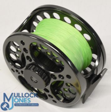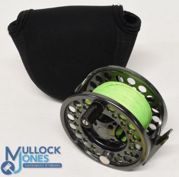 Guideline Inex alloy salmon 911 fly reel 3 3/4" wide caged double ventilated spool, counter balanced handle, large rear spindle tensioner, sealed drag neoprene pouch. Very light use, runs well