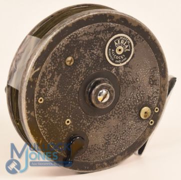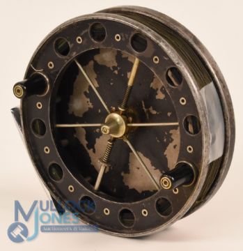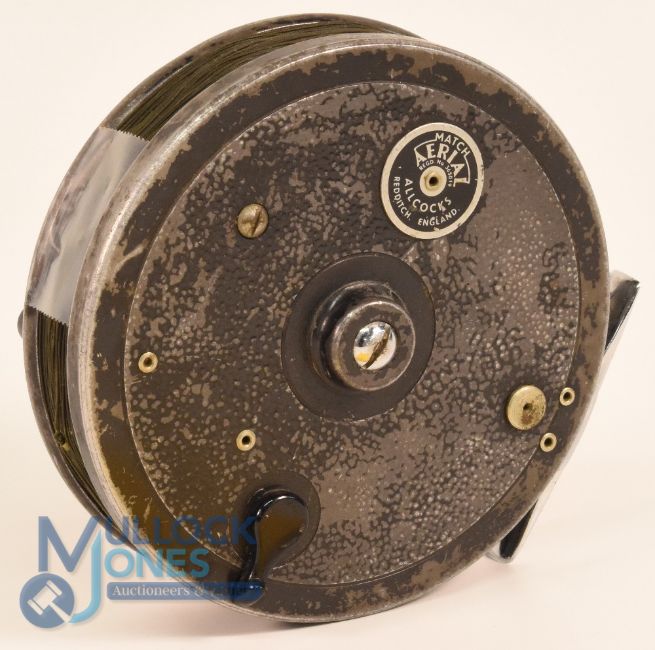 Allcocks Ltd Redditch Match Aerial alloy centre pin/trotting reel - 4 1/2" narrow caged ventilated 6 spoke spool with spoke tensioner and catch, twin handles, on/off check. In suede pouch, signs of wear, spins well