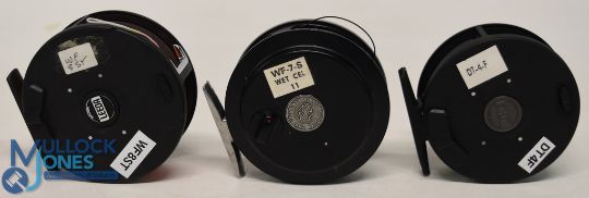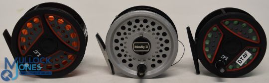 A collection of fly reels, all without cases, as follows: Leeda LC 100 cartridge fly reel, 3 1/2" spool, push button spool release, sliding rear tensioner, constant check, very light use. Leeda LC 80, as above with 3 1/4" spool, very light use. BFR Rimfly II fly reel, 3 1/2" spool, rear tensioner, constant check, very light use. (3)