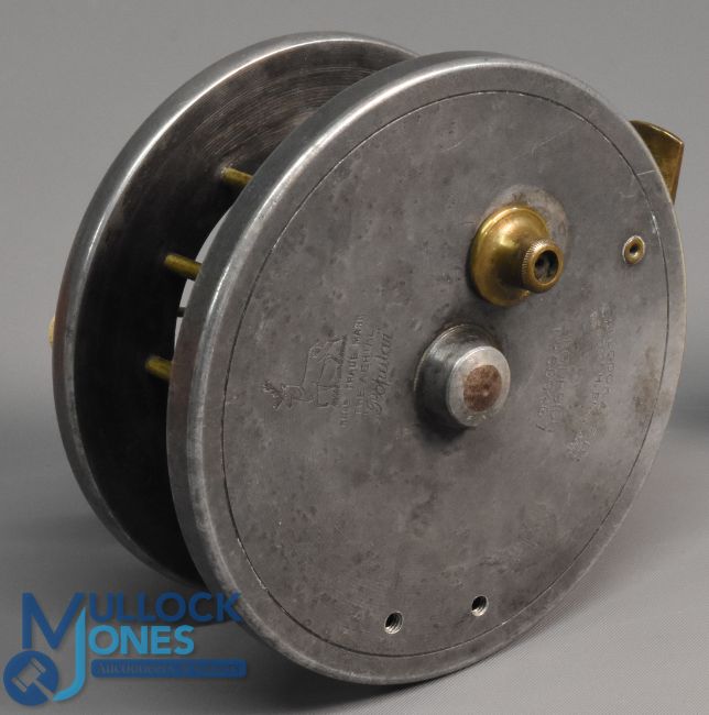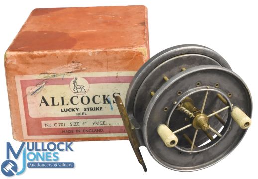 S Allcock & Co Redditch "The Aerial Popular" centre pin/trotting reel, 3 1/2" caged wide spool with twin Xylonite handles, 6 spoke with spindle tensioner (pre War), on/off check, stamped Stag Logo. Very light wear. In Allcocks box (not correct), runs well