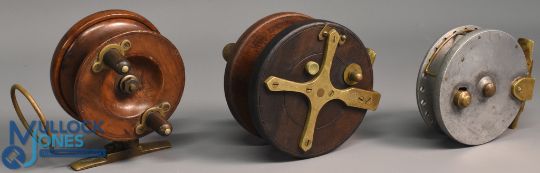 3x Various reels - features an Alex Martin of Aberdeen 4" Nottingham star back reel with Preedy patent push-drag control, on/off check and twin turned wood handles, unnamed 3 ½" Nottingham star back reel with twisting foot and optional check, lacking check button with replacement drum nut and unusual 3 ½" alloy trotting reel with optional check, spins well