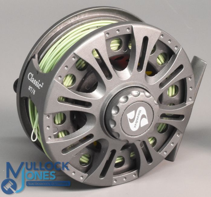 Snowbee Classic 7/8 fly reel and 2x spare spools in grey finish, with counter balance, rear drag adjuster, light signs of use, all loaded with line (3)