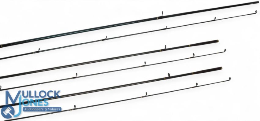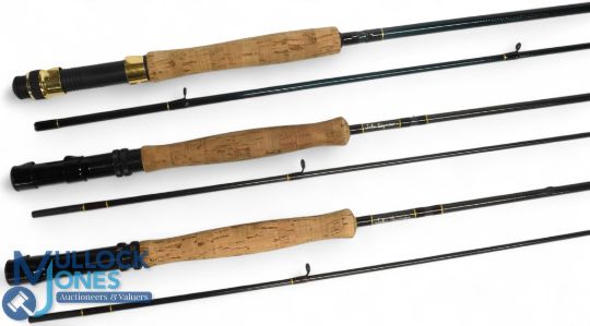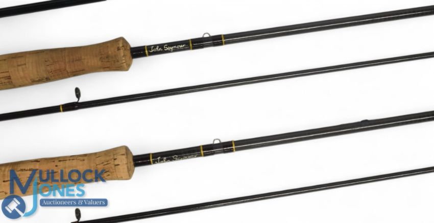 A collection of rods as follows: 2x John Seymour carbon trout fly rods, both 9ft 2pc, line 7/8#, alloy double down locking reel seat, lined rings throughout. Both in one bag. Light use. Unnamed 10ft carbon trout fly rod, alloy reel set, lined rings (bag too short), light use. (3)