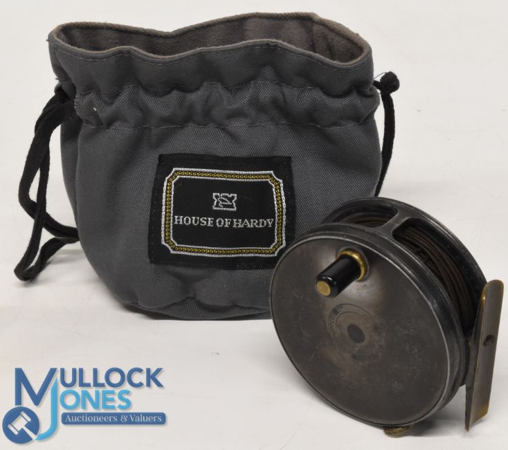 Hardy Bros "The Perfect" alloy Duplicated Mk II trout fly reel 3 1/8" double ventilated spool with black handle, milled rim tensioner, constant check, ribbed brass foot. In Hardy cloth draw string pouch. Wear for age, runs very well