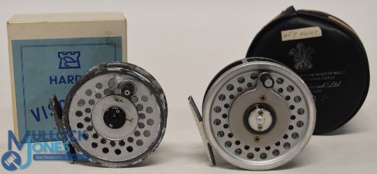 Hardy Bros "The Marquis 7" multiplier alloy trout fly reel 3 7/16" ventilated spool, 2 screw latch, black handle, rear tensioner, constant check, 'U' shaped alloy line guide and foot (missing spindle nut cover), MZC. Runs well. Hardy Bros "The Viscount 130" alloy trout fly reel 3 1/4" ventilated spool, 2 screw latch, black handle, rear tensioner, constant check. Correct box and instructions. Badly corroded, runs well. (2)