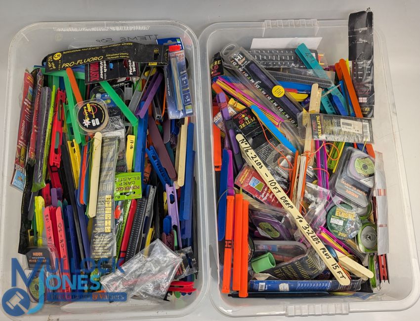 Huge Collection of Plastic Pole Line Winders, Line and other fishing tackle accessories (2 boxes)
