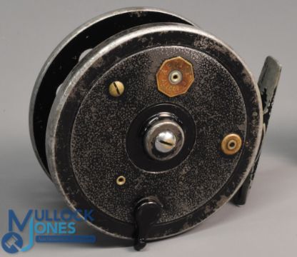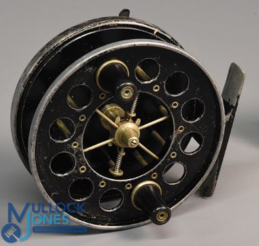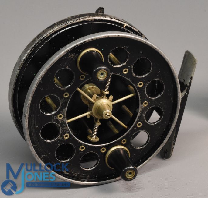 Allcocks Aerial alloy centre pin trotting reel, 3 3/4" caged wide ventilated 6 spoke spool, 6 spindles with tensioner and spool catch, twin handles, on/off check, signs of wear. Angling Times zip case. Runs well