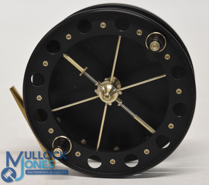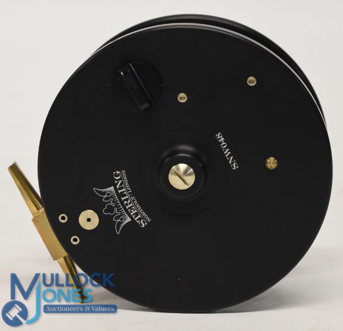 A fine Sterling Northolt London SNW048 alloy aerial centrepin trotting reel (not a machine gun!), 4 1/2" caged wide spool, 6 spokes, spoke tensioner and spoke spool release, twin handles, on/off check, brass foot. Looks unused. Rare thing