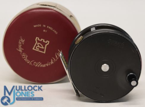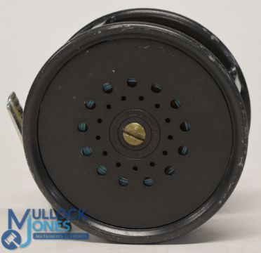 Hardy Bros "The Perfect" alloy salmon fly reel 3 3/4" ventilated wide spool with black handle, milled rim tensioner, constant check, ribbed alloy foot, stamped straight line logo, MZC. Light use, runs very well