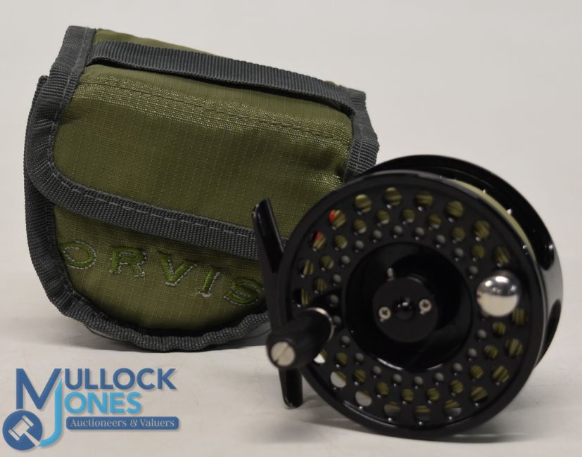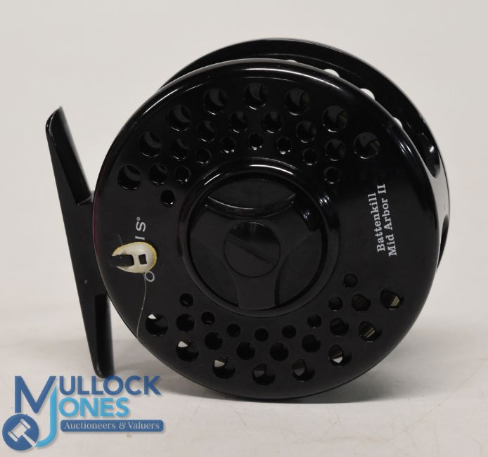 Orvis USA Battenkill Mid Arbor II alloy trout fly reel, 3" ventilated spool, 2 screw latch, counter balanced handle, large rear spindle tensioner, constant check. Orvis case, very light use