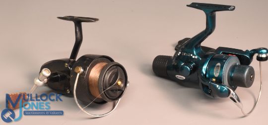 Mitchell Spinning reels (2) features a Mitchell 301 RHW reel foot stamped 469231 in maker's card box, t/w a Mitchell Star 50 reel with folding handle, spare spool in maker's card box