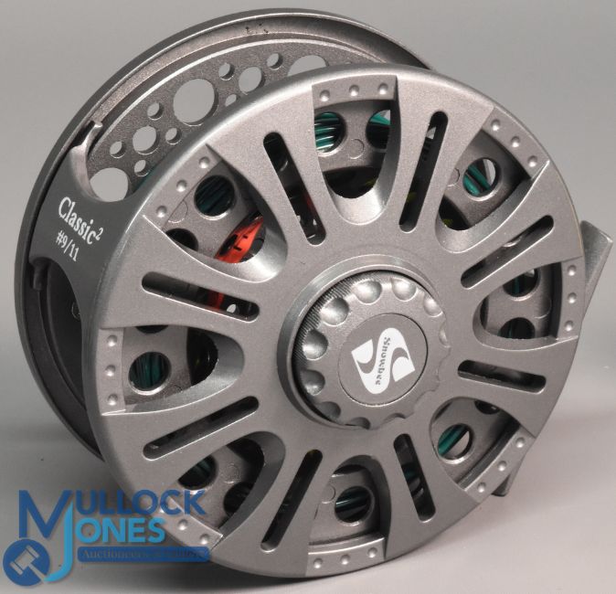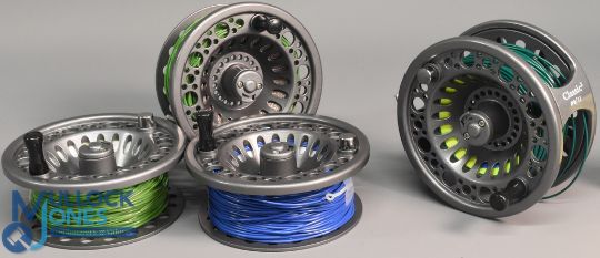 Snowbee Classic 9/11 fly reel and 3x spare spools in grey finish, with counter balance, rear drag adjuster, light signs of use, all loaded with line (3)