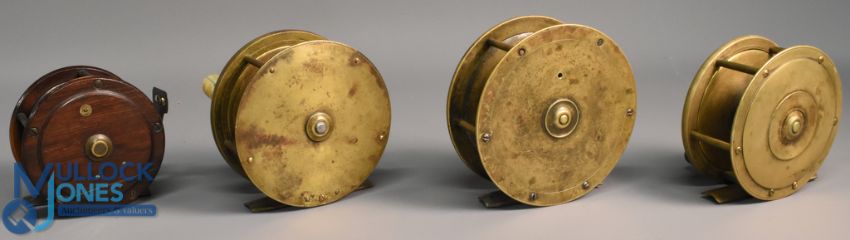 4x Scottish antique reels - to incl W Garden maker Aberdeen 4" all brass anti-foul crank reel with polished horn handle, smooth check, reel fitted into a custom wooden box, Walsh of Dundee 3 ½" Laburnum wood Scottish pattern reel with nickel face plate, crack to back plate, a Graham & Co Inverness 4 ½" all brass plate wind reel, lacking check, and a Forest & Sons Kelso 4 ¼" salmon fly reel with second handle fitted to face plate