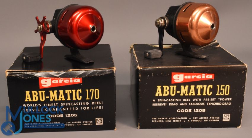 ABU Garcia Abumatic closed face reels (2) features a 170 model with oil and casting plug, in maker's card box, t/w a 150 model with maker's card box (flap missing) - both with Garcia badges