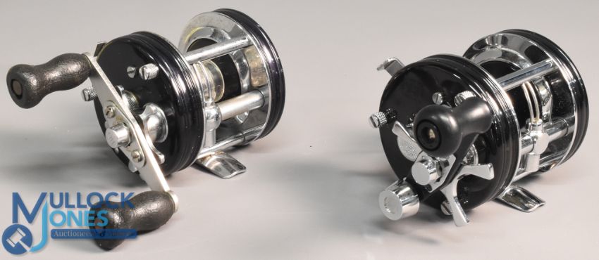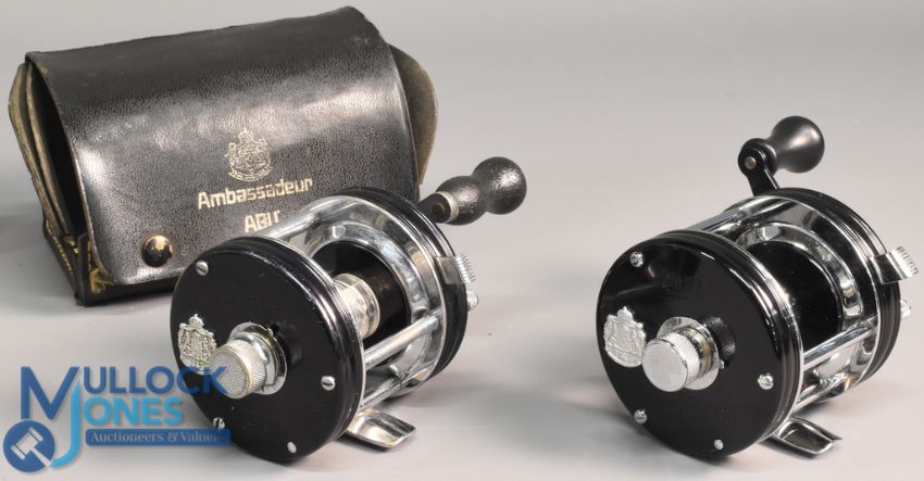 2x ABU Ambassadeur 5000C multiplier reels - both in black finish, feet stamped 730101and 850100 - 1x with twin handle, the other a counter balance handle, star drags, level wind, c/w a maker's black case - generally clean condition overall