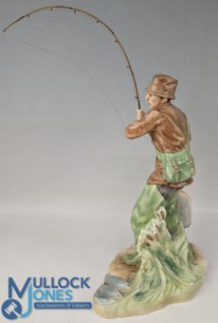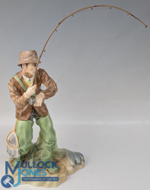 A Rare Royal Worcester Angling Figure 'Fly Fishing' inscribed in gold 'From Royal Worcester to the Fishing Club to Commemorate its 75th Anniversary', 21cm high, gold printed mark and written inscription. In good condition