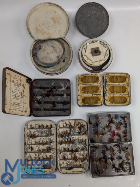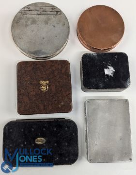 6x Vintage fly tins and boxes incl 5" Dia nickel on brass cast tin by Wheatley, similar 4" copper cast damper with 2x winders, Allcock Smithson fly box with maker's label internally, Malloch black japanned slim fly tin and flies, plus 2x others