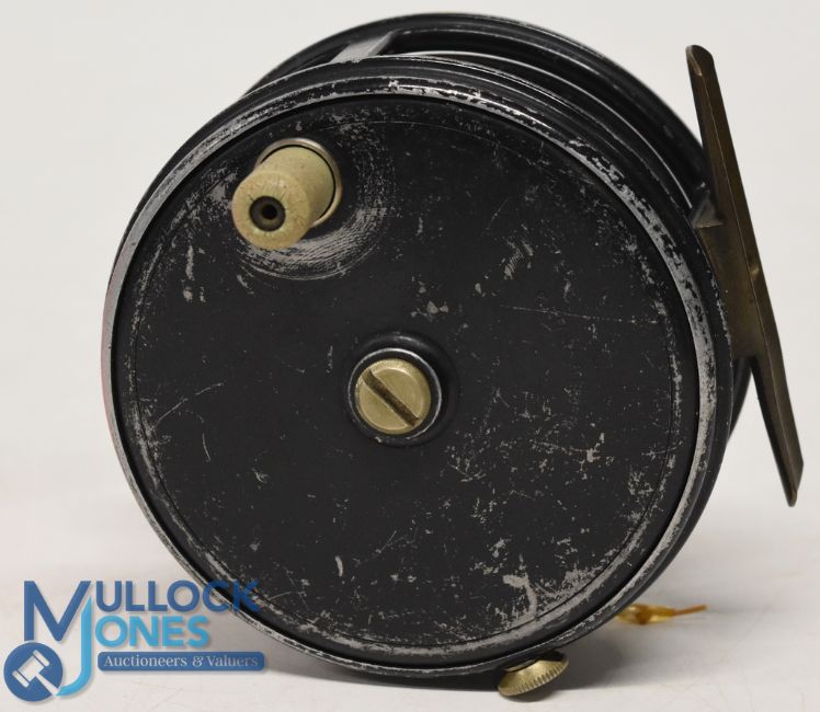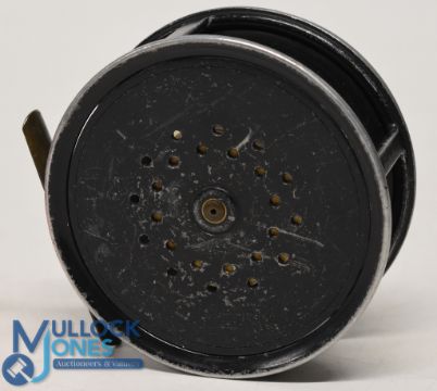 Playfair of Aberdeen 4 ¼" vintage alloy Perfect style fly reel, rim tension adjuster, crazed white handle, smooth brass foot, turns smooth, with crisp check, retains good finish.