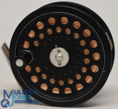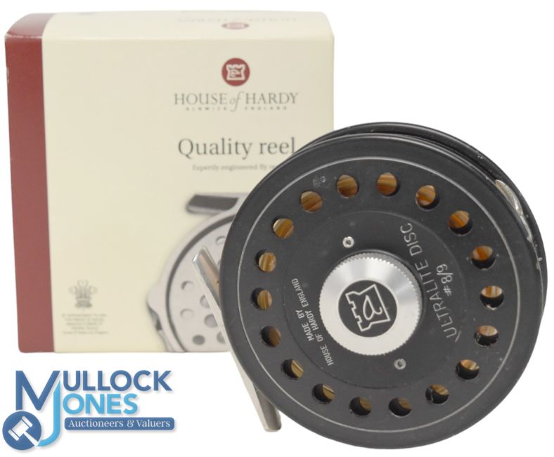 Hardy Bros "The Ultralight Disc" alloy trout fly reel No JRM 824, line 8/9# 3 3/4" ventilated spool, 2 screw latch, black handle, large rear spindle tensioner, constant check, 'U' shaped alloy line guide and foot. MZC, box and instructions. Very light use