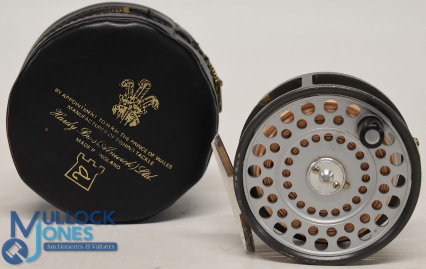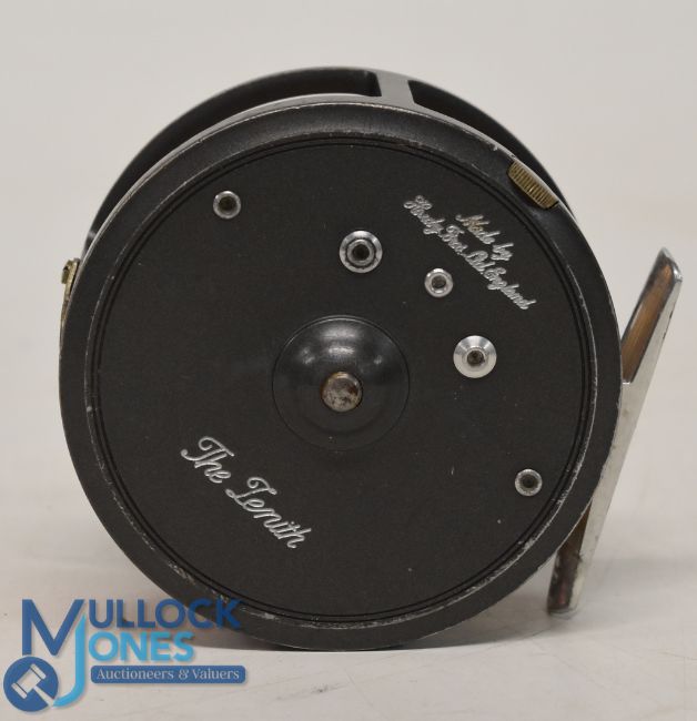 Hardy Bros "The Zenith" alloy trout fly reel 3 3/8" wide ventilated spool, 2 screw latch, black handle, milled rim tensioner, large 'U' shaped line guide and smooth alloy foot, MZC. Very light use, runs well