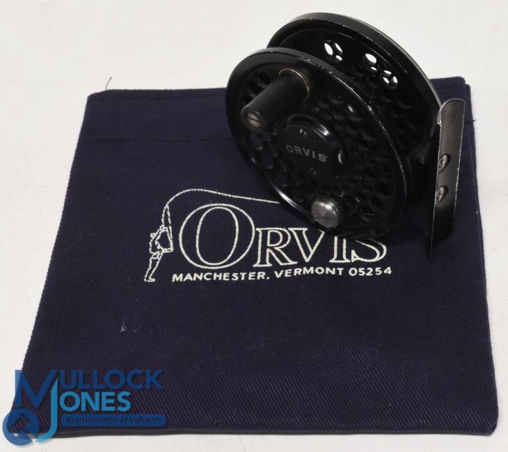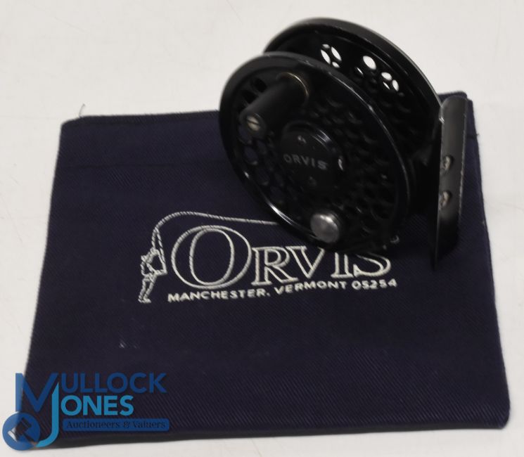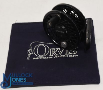 Orvis small mid arbor disc drag alloy fly reel 2 3/4" double vented spool, 3/4 WT line, 2 screw latch counter balanced handle, rear tensioner, light use, runs very well. In Orvis pouch