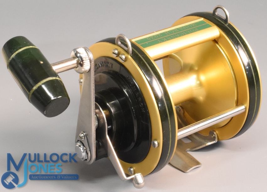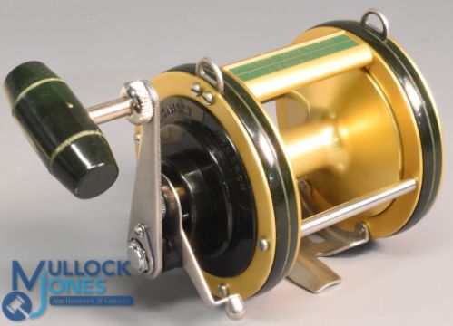 Policansky Monarch 2020 big game multiplier reel in gold and black finish, optional check, torpedo handle, side drag adjuster, with rod clamp, appears in good condition in maker's card box