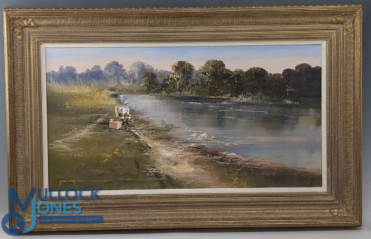 John Horsewell, River Scene, with a fisherman, signed, oil on canvas, in gilded gold frame 40 x 76cm