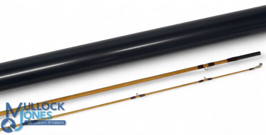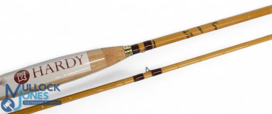 Fine Hardy CC de France 8' 2 piece split cane fly rod, #5, brand new unused condition, bought & never fished. burgundy whipped guides, gold intermediates, bronze ferrule with stopper, shrink wrapped cork handle with label to underside. A rare opportunity to buy a brand new Hardy rod, c/w maker's original bag & screw top alloy tube.