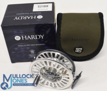 A fine Hardy Bros "Swift" 975 No J11500 Mk II alloy trout/salmon fly reel, 3" ventilated spool, 3 screw latch, counter balanced handle, large rear spindle tensioner, constant check. In correct original box with instructions and warranty card, neoprene pouch. Looks unused, very nice